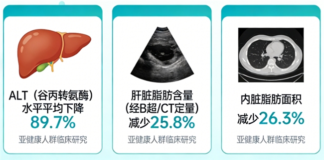 肝脏脂肪浸润逆转:通过影像学检查(B超/CT)证实,肝脏脂肪含量平均减少25.8%,内脏脂肪面积缩减26.3%,伴随甘油三酯水平平均下降48.5%。
